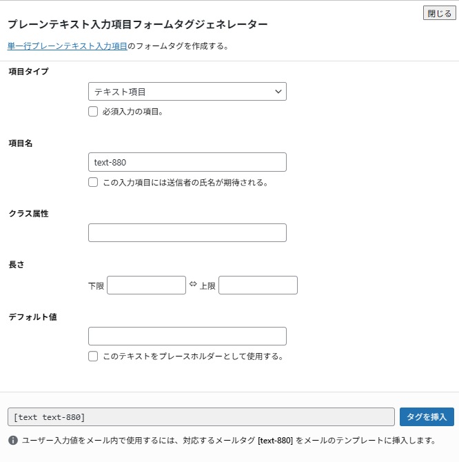 Contact Form 7 でフォームを作成する際、最も頻繁に使うのが 「テキスト入力項目」 です。お名前、会社名、電話番号など、1行で入力してもらう項目は、基本的にこの設定から作成します。