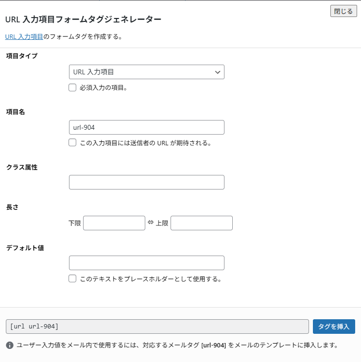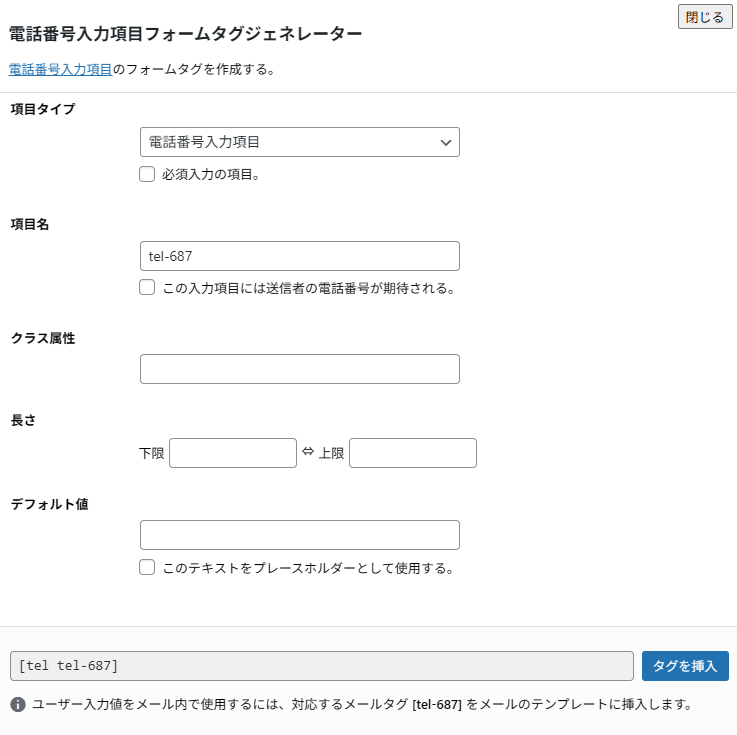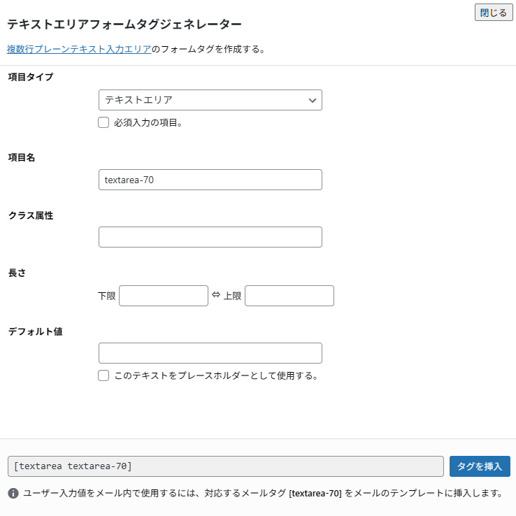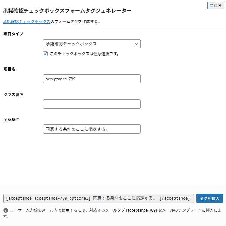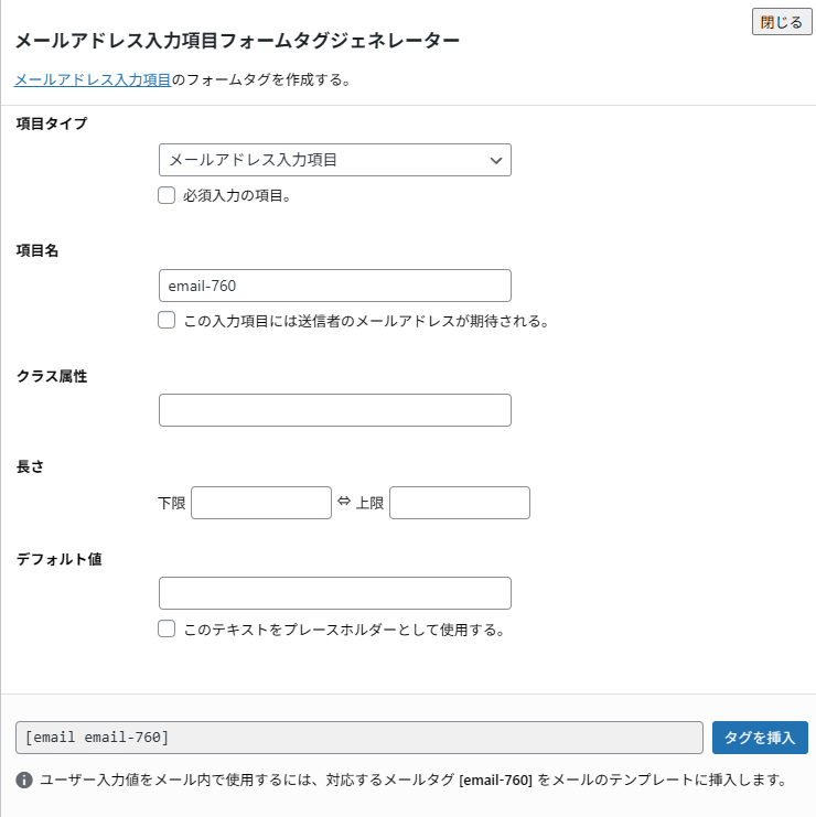 このチェックを入れると、この項目が「送信者名」であることをContact Form 7に伝える設定になります。