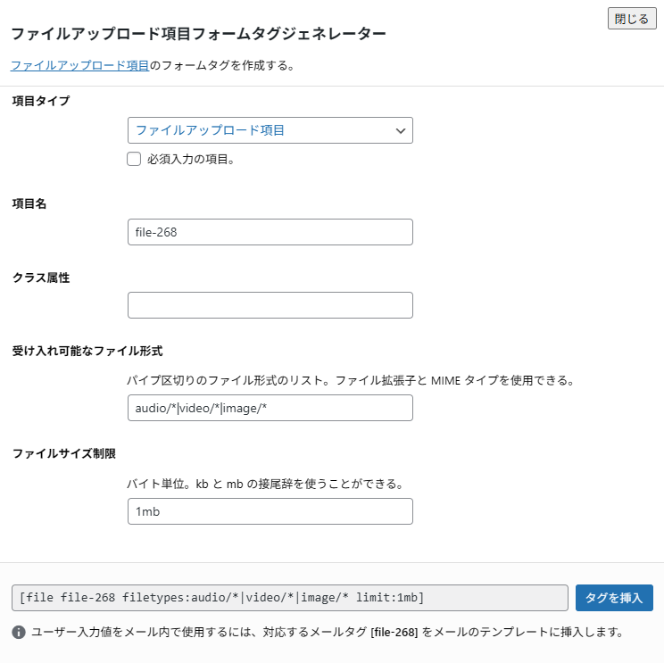 ファイルアップロード項目で受け取ったファイルをメールに添付する設定です。