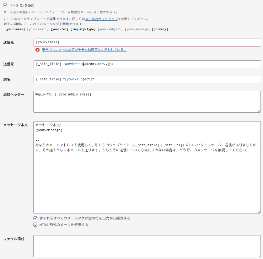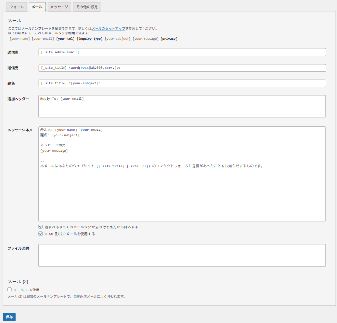 Contact Form 7 の 「メール(2)」 は、フォーム送信後に ユーザー本人へ自動的に送られる確認メールです。