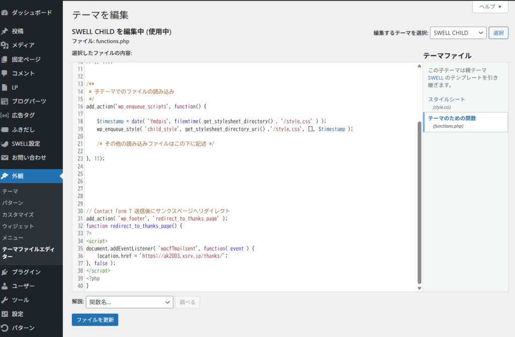 ここでは、SWELLテーマでContact Form 7 の送信ボタンを押した時に、サンクスページへ飛ばす設定を簡単にご紹介します。