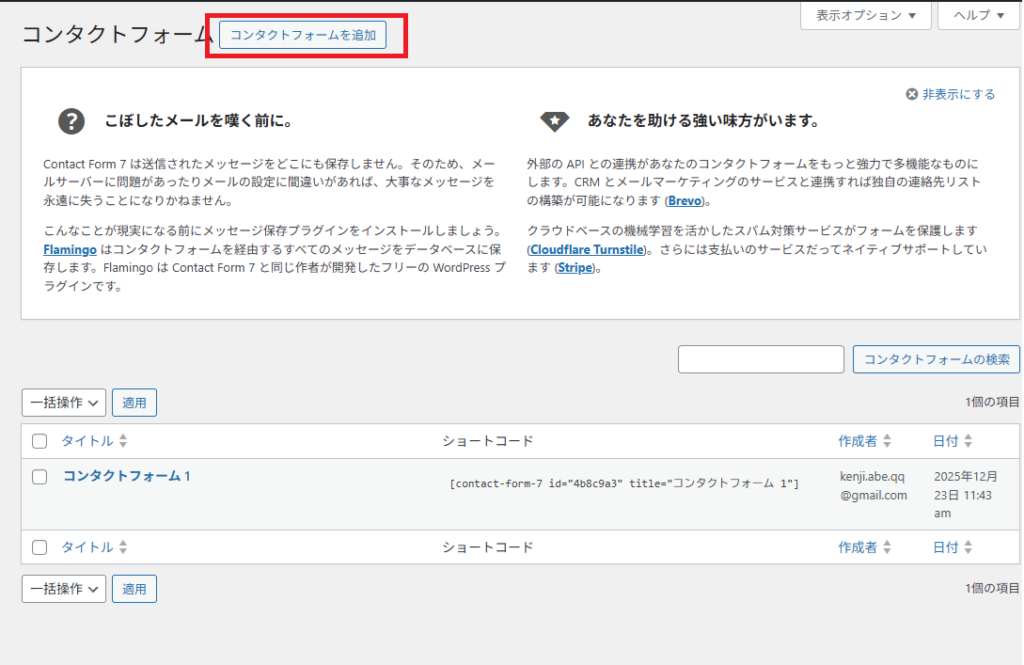 デフォルトで【コンタクトフォーム1】が用意されいています。