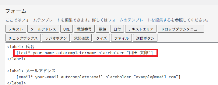 ですので、上のように「text-880」という記載だと何を表しているかわかりにくいので、 項目名は氏名や会社名を入力するのであれば、「name」「your-name」「company」など意味が分かる名前に変更するのがおすすめです。